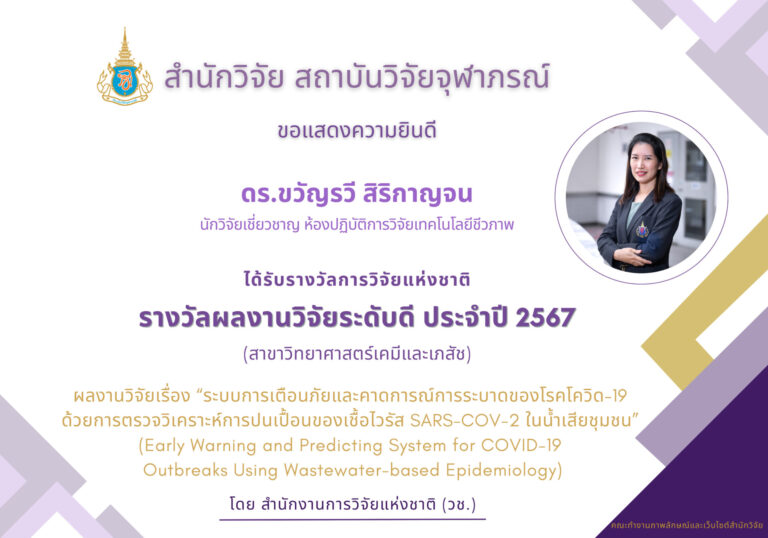 1.2 รางวัลผลงานวิจัย ระดับดี สาขาวิทยาศาสตร์เคมีและเภสัช ผลงานวิจัยเรื่อง ระบบการเตือนภัยและคาดการณ์การระบาดของโรคโควิด-19 ด้วยการตรวจวิเคราะห์การปนเปื้อนของเชื้อไวรัส SARS-CoV-2 ในน้ำเสียชุมชน (Early Warning and Predicting System for COVID-19 Outbreaks Using Wastewater-based Epidemiology) ของห้องปฏิบัติการวิจัยเทคโนโลยีชีวภาพ โดยมี ดร.ขวัญรวี สิริกาญจน เป็นหัวหน้าโครงการ และนักวิจัยสถาบันวิจัยจุฬาภรณ์เป็นผู้ร่วมงานวิจัยประกอบด้วย ศาสตราจารย์เกียรติคุณ ดร.ศกรณ์ มงคลสุข และนางสาวมนทกานต์ ศรีสังข์