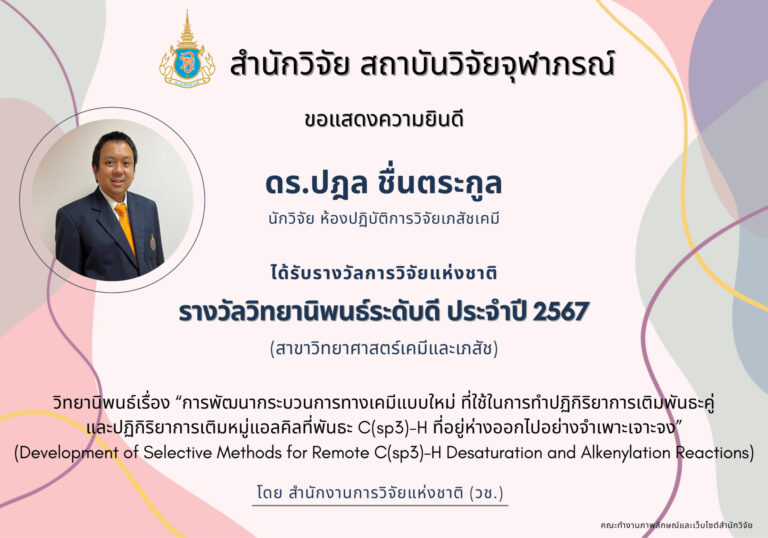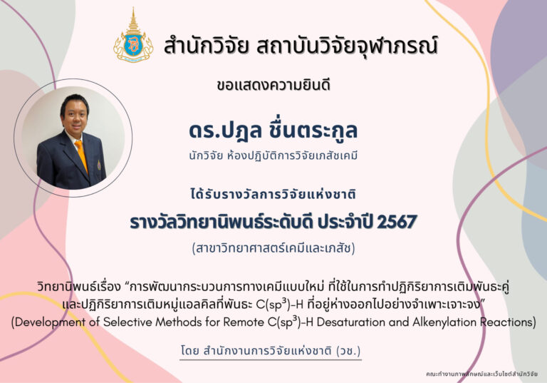2. รางวัลวิทยานิพนธ์ ระดับดี สาขาวิทยาศาสตร์เคมีและเภสัช ประจำปีงบประมาณ 2567 จำนวน 1 รางวัล จากวิทยานิพนธ์เรื่อง การพัฒนากระบวนการทางเคมีแบบใหม่ที่ใช้ในการทำปฏิกิริยา การเติมพันธะคู่และปฏิกิริยาการเติมหมู่แอลคิลที่พันธะ C(sp3)-H ที่อยู่ห่างออกไปอย่างจำเพาะเจาะจง (Development of Selective Methods for Remote C(sp3)-H Desaturation and Alkenylation Reactions ) ของ ดร.ปฎล ชื่นตระกูล นักวิจัยห้องปฏิบัติการวิจัยเภสัชเคมี