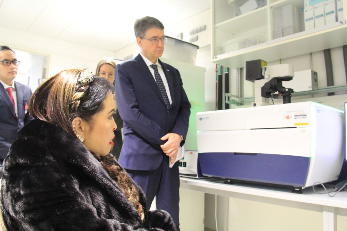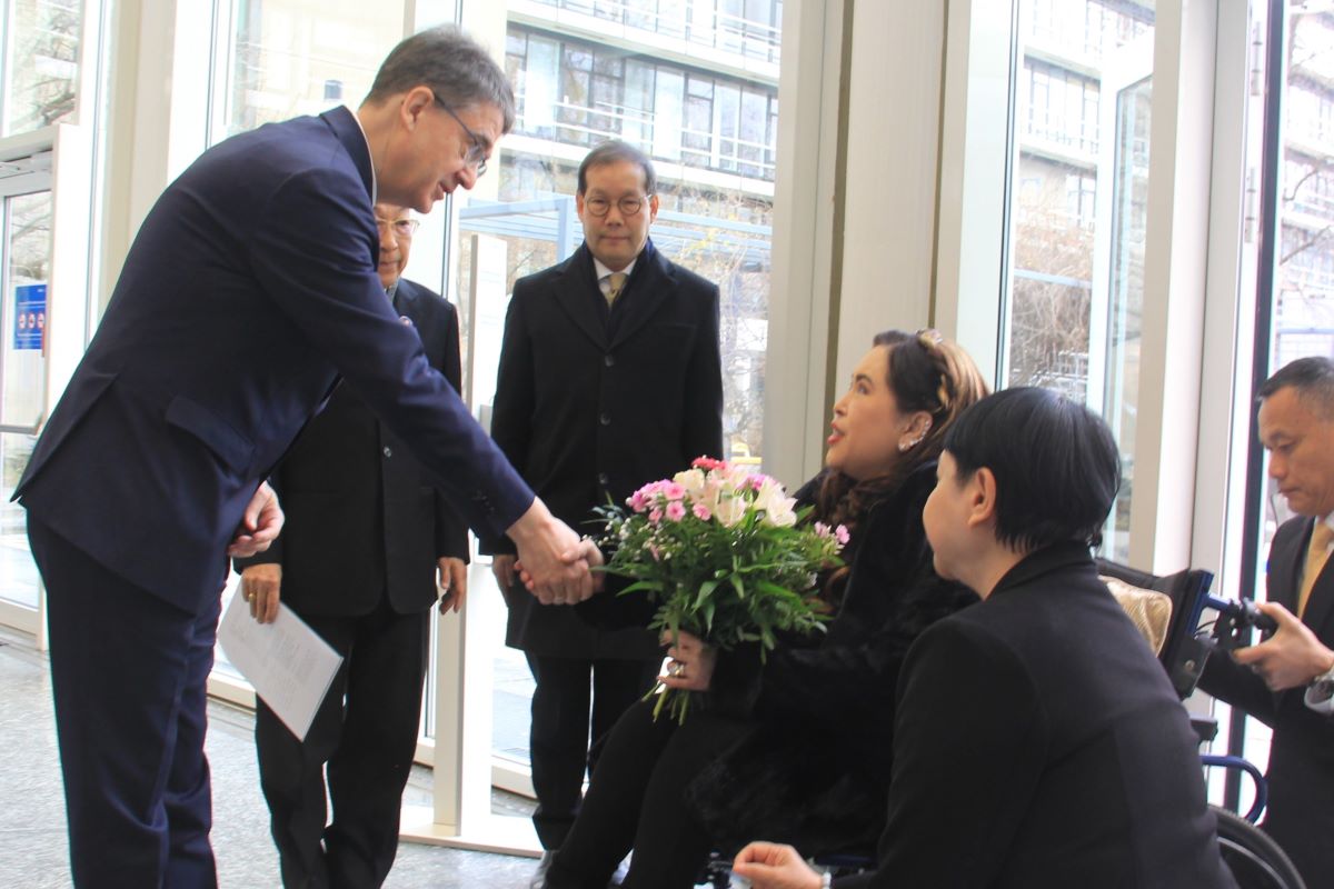 พร้อมกันนี้ ทรงรับฟังการบรรยายสรุปการดำเนินงานทางวิชาการ และผลงานวิจัยเกี่ยวกับการศึกษาวิจัยโรคมะเร็งในเด็ก การศึกษาทางชีวสารสนเทศประยุกต์ในงานวิเคราะห์ตัวอย่างเลือดของผู้ป่วยมะเร็ง ทั้งนี้ เพื่อเป็นการแลกเปลี่ยนองค์ความรู้และขยายความร่วมมือด้านการวิจัย การศึกษา ตลอดจนการแลกเปลี่ยนนักศึกษาและบุคลากรระหว่างทั้งสองสถาบัน