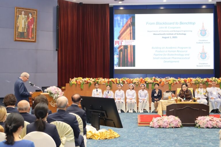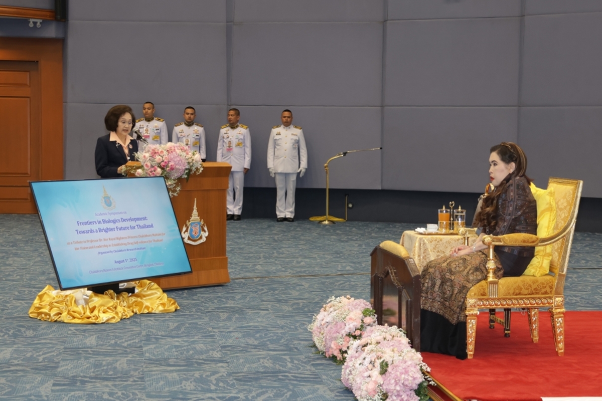 มหาภูมิพลอดุลยเดชมหาราช บรมนาถบพิตร จึงได้ทรงฝากฝังกับข้าพเจ้าซึ่งได้ก่อตั้งสถาบันวิจัยจุฬาภรณ์ ให้หาทางที่จะสร้างศักยภาพทางวิทยาศาสตร์และเทคโนโลยีเพื่อให้ประเทศไทยมีความมั่นคงทางยา พึ่งพาตนเองได้ โดยทำการวิจัยเพื่อนำไปสู่การพัฒนายา…” และทรงรับฟังปาฐกถาเฉลิมพระเกียรติฯ โดยศาสตราจารย์ ราม ซาซิเซคาราน (Professor Ram Sasisekharan) จากสถาบันเทคโนโลยีแห่งแมสซาซูเซตส์ สหรัฐอเมริกา (Massachusetts Institute of Technology -MIT), USA ในหัวข้อเรื่อง “สดุดีพระเกียรติคุณ ศาสตราจารย์ ดร. สมเด็จพระเจ้าน้องนางเธอ เจ้าฟ้าจุฬาภรณวลัยลักษณ์ฯ: บทบาทของประเทศไทยในยุคที่ยาชีววัตถุมีความสำคัญระดับโลก” (A Tribute to Her Royal Highness Princess Chulabhorn Mahidol: Thailand’s Role in the Global Biologics Era) ต่อจากนั้น ทรงรับฟังการบรรยายพิเศษในหัวข้อเรื่อง “จากการเรียนการสอนสู่ห้องปฏิบัติการ: จุดเริ่มต้นของยาชีววัตถุในประเทศไทย” (From Blackboard to Benchside: The Origin of Biologics in Thailand) โดยศาสตราจารย์ จอห์น เอ็ม เอสซิกแมน (Professor John M. Essigmann) จากสถาบันเทคโนโลยีแห่งแมสซาชูเซตส์ ประเทศสหรัฐอเมริกา (Massachusetts Institute of Technology -MIT), USA ซึ่งสดุดีพระปรีชาสามารถในการวางรากฐานการพัฒนายาควบคู่ไปกับการพัฒนาบุคลากรให้ประเทศ