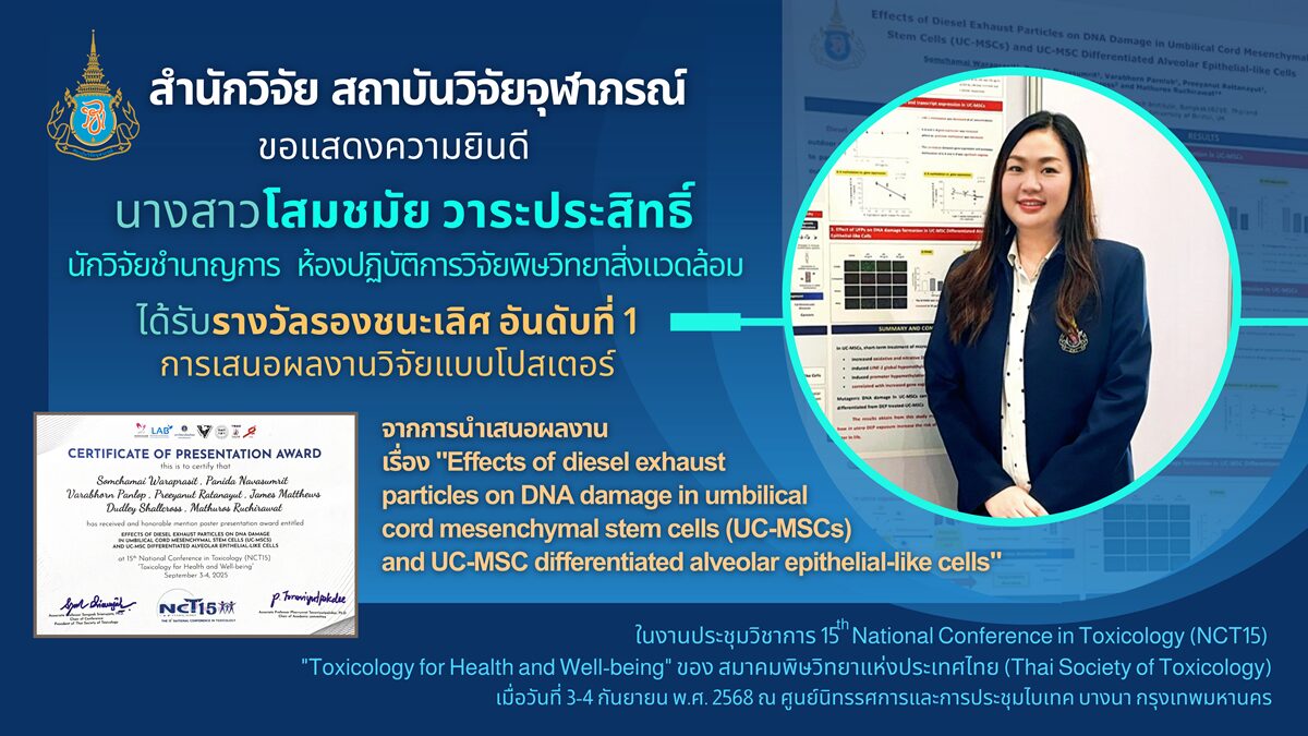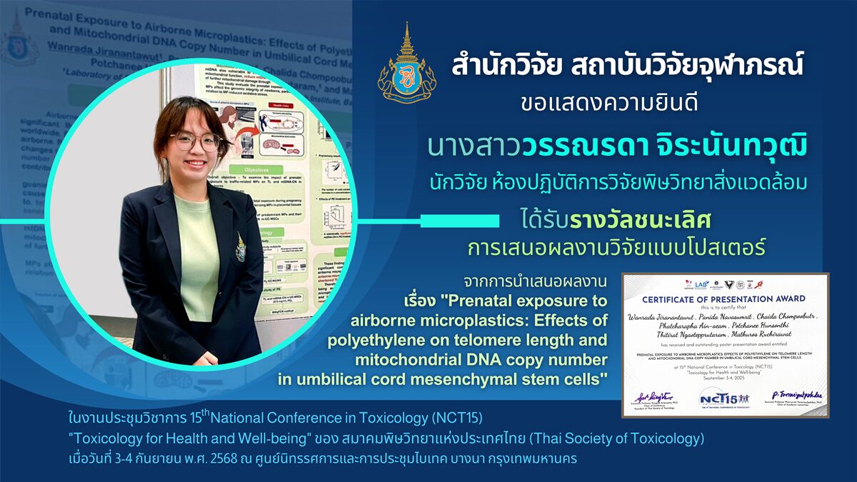 หน้าหลัก สำนักงานสำนักวิจัย ข่าวสารและกิจกรรมสำนักวิจัย นักวิจัยห้องปฏิบัติการวิจัยพิษวิทยาสิ่งแวดล้อม ได้รับรางวัลการเสนอผลงานวิจัยแบบโปสเตอร์ในงานประชุมวิชาการ The 15th National Conference in Toxicology (NCT15) ระหว่างวันที่ 3-4 กันยายน 2568