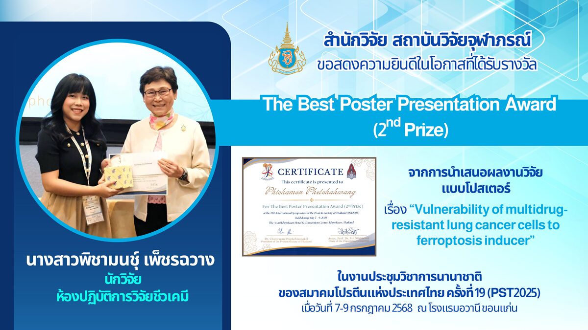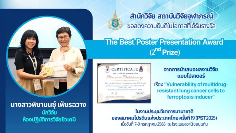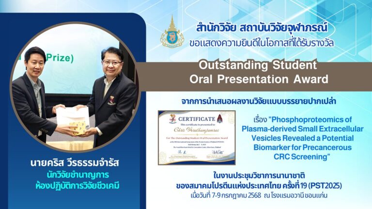 หน้าหลัก สำนักงานสำนักวิจัย ข่าวสารและกิจกรรมสำนักวิจัย นักวิจัยห้องปฏิบัติการวิจัยชีวเคมี ได้รับรางวัลการเสนอผลงานวิจัยในการประชุมวิชาการนานาชาติ The 19th International Symposium of the Protein Society of Thailand ระหว่างวันที่ 7-9 กรกฎาคม 2568