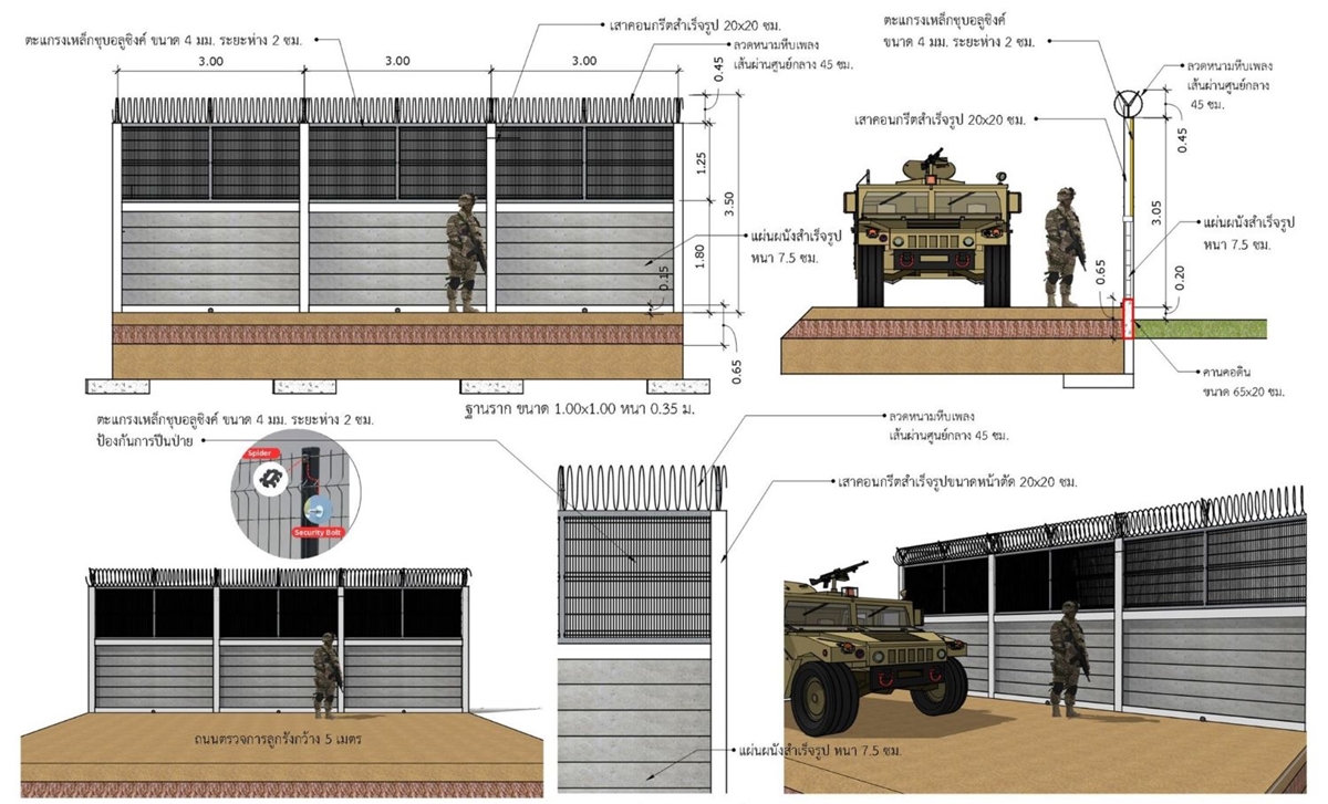 นอกจากนี้ รูปแบบการก่อสร้างรั้วชายแดน จะดำเนินการออกแบบให้มีคุณลักษณะคงทน ถาวร สามารถป้องกันการบุกรุกทำลาย รื้อถอน หรือ การลักลอบข้ามแดนทั้งการขุดลอดและการปีนข้าม เป็นรั้วความสูง 3.50 เมตร มีครึ่งล่างของรั้วเป็นคอนกรีตสำเร็จรูปอัดแรง ครึ่งบนเป็นตะแกรงเหล็กชุบอลูชิงค์ มีความทนทาน วางด้านบนด้วยลวดหนามหีบเพลงเส้นเพลงศูนย์กลาง 45 เซนติเมตร พร้อมก่อสร้างถนนตรวจการณ์ผิวจราจรลูกรัง กว้าง 5 เมตร