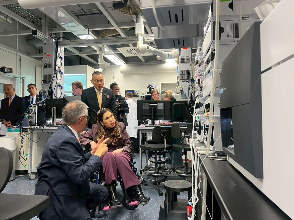ในโอกาสเดียวกันนี้ เสด็จไปทอดพระเนตรกระบวนการวิจัยผลิตภัณฑ์ธรรมชาติของห้องปฏิบัติการเฉพาะทางสำหรับการแยกสารและทำให้สารต่าง ๆ มีความบริสุทธิ์ด้วยวิธี “โครมาโตกราฟีของเหลวความดันสูง” ซึ่งเป็นเทคนิคทางเคมีที่ใช้ในการแยกสารต่าง ๆ ที่ผสมอยู่ในตัวอย่างสารสกัดผลิตภัณฑ์ธรรมชาติ รวมถึงการใช้เครื่องมือตรวจวัดมวลโมเลกุล เพื่อตรวจสอบและวิเคราะห์โครงสร้างของสารประกอบขั้นสูง
