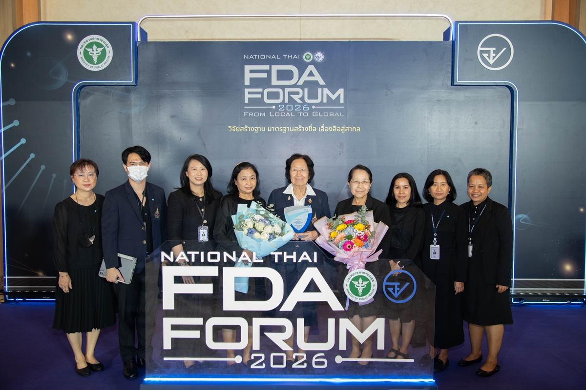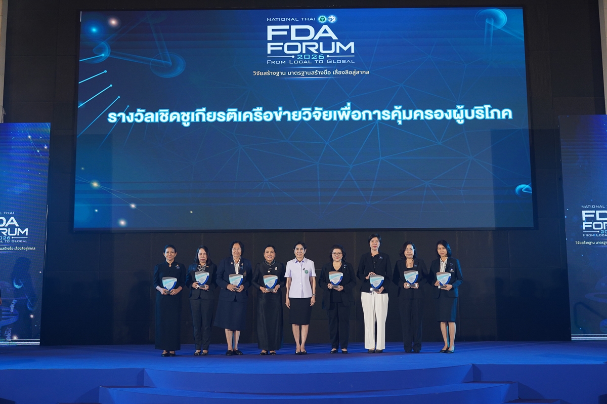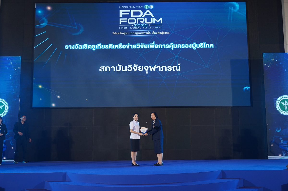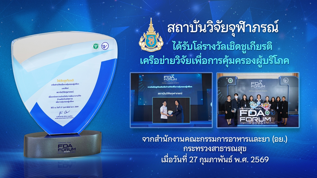 สถาบันวิจัยจุฬาภรณ์ รับมอบโล่รางวัลเชิดชูเกียรติเครือข่ายวิจัยเพื่อการคุ้มครองผู้บริโภค จากสำนักงานคณะกรรมการอาหารและยา (อย.) กระทรวงสาธารณสุข ในงานประชุมวิชาการคุ้มครองผู้บริโภคด้านผลิตภัณฑ์สุขภาพแห่งชาติ ประจำปี 2569 (National Thai FDA Forum 2026) ภายใต้แนวคิด “From Local to Global : วิจัยสร้างฐาน มาตรฐานสร้างชื่อ เลื่องลือสู่สากล” เมื่อวันที่ 27 กุมภาพันธ์ 2569 ณ ศูนย์ประชุมวายุภักษ์ โรงแรมเซ็นทารา ไลฟ์ ศูนย์ราชการและคอนเวนชันเซ็นเตอร์ แจ้งวัฒนะ กรุงเทพมหานคร