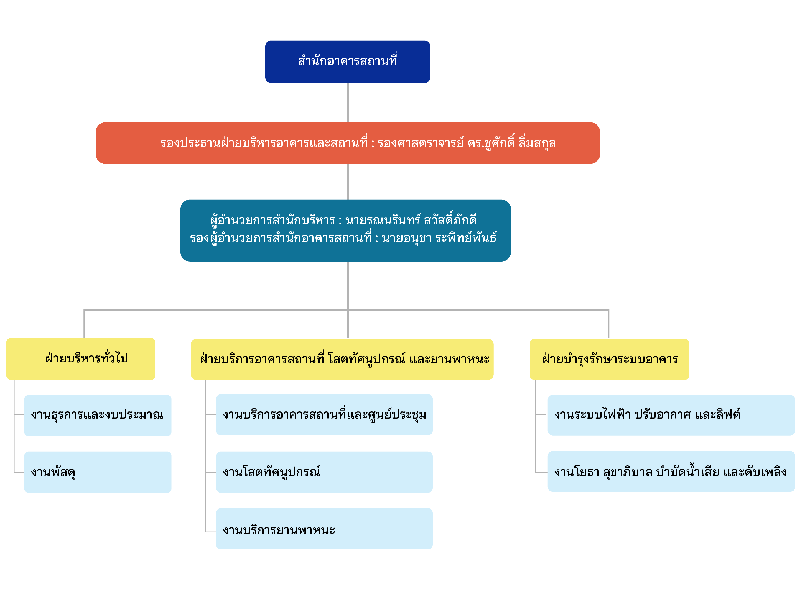 - บริหารการใช้อาคารสถานที่ ดูแลความเรียบร้อยของห้องประทับ ห้องประชุม งานทำความสะอาด งานรักษาความปลอดภัย งานบริการยานพาหนะและงานดูแลสวนและภูมิทัศน์โดยรอบ
