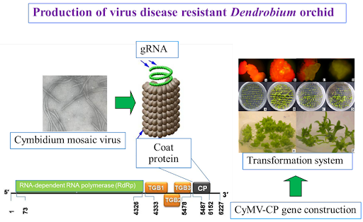 กล้วยไม้จัดเป็นหนึ่งในพืชเศรษฐกิจของประเทศไทย กล้วยไม้หลายสกุลมีความไวต่อการเป็นโรคไวรัสที่อาจส่งผลกระทบต่อผลผลิตได้ ห้องปฏิบัติการวิจัยเทคโนโลยีชีวภาพได้ศึกษายีนที่ผลิตโปรตีนหุ้มอนุภาคไวรัสยอดบิด Cymbidium mosaic virus (CyMV-CP) ในกล้วยไม้สกุลต่าง ๆ ได้แก่ กล้วยไม้สกุลหวาย (Dendrobium) สกุลออนซิเดียม (Oncidium) สกุลม็อคคาร่า (Mokara) และ สกุลแคทลียา (Cattleya) และพบว่ายีนมีองค์ประกอบทางพันธุกรรมใกล้เคียงกัน ห้องปฏิบัติการฯ ได้นำองค์ความรู้นี้มาใช้ในการปรับปรุงพันธุ์และผลิตกล้วยไม้สกุลหวายให้ปลอดไวรัส ด้วยเทคโนโลยี RNA interference (RNAi) ในการส่งถ่ายยีนหุ้มอนุภาคไวรัสยอดบิดในรูปอาร์เอ็นเอสายคู่ ที่สร้างในห้องปฏิบัติการฯ ไปยังกล้วยไม้สกุลหวายที่เป็นโรคไวรัส การทดลองครั้งนี้ครอบคลุมไปถึงการออกแบบอาร์เอ็นเอสายคู่ที่มีความจำเพาะต่อยีนหุ้มอนุภาคไวรัสยอดบิด (แผนภาพ) ผลการศึกษาพบว่ากล้วยไม้สกุลหวายเป็นโรคไวรัสที่ผ่านกระบวนการนี้ ปลอดไวรัสหลังการถ่ายยีนโดยใช้ระยะเวลา 1 ปี