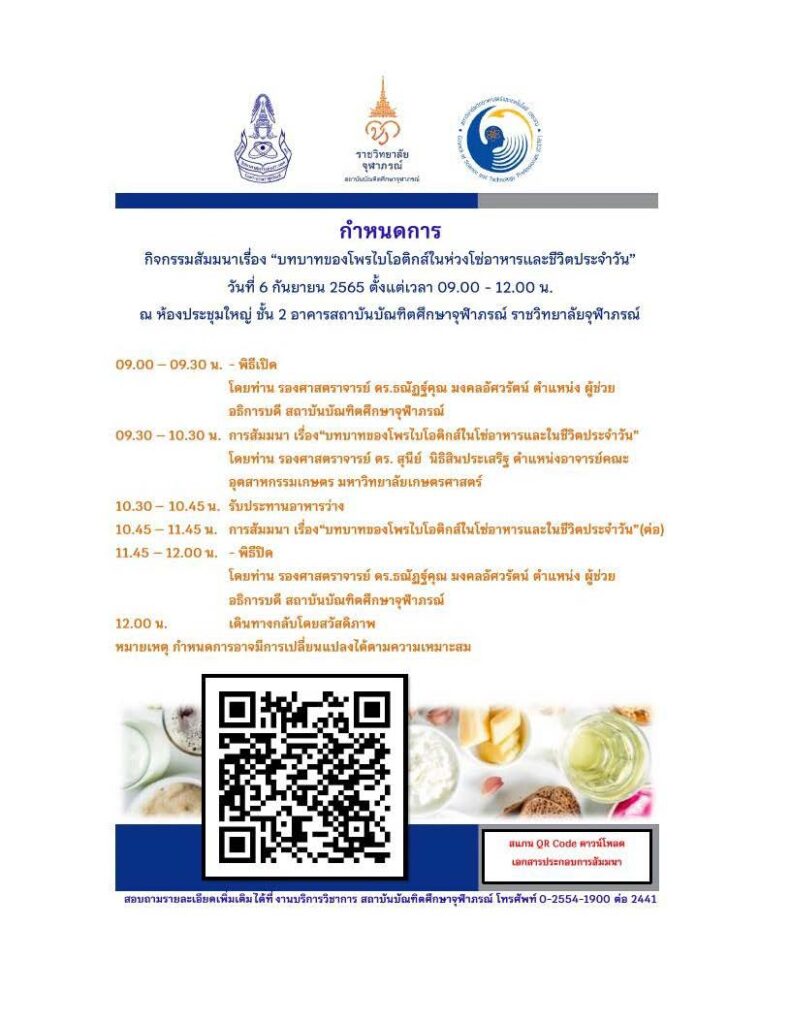 สถาบันบัณฑิตศึกษาจุฬาภรณ์ ราชวิทยาลัยจุฬาภรณ์ ร่วมกับ สมาคมวิทยาศาสตร์แห่งประเทศไทย ในพระบรมราชูปถัมภ์ และสภาวิชาชีพวิทยาศาสตร์และเทคโนโลยี กำหนดจัดโครงการบริการวิชาการแก่สังคม ประจำปี พ.ศ. 2565 เรื่อง “บทบาทของโพรไบโอติ...